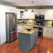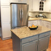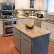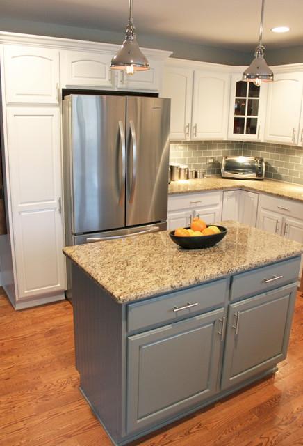 White cabinets with light blue island.