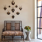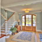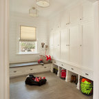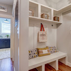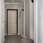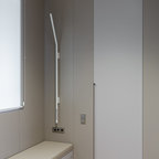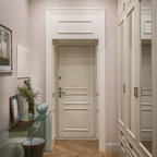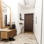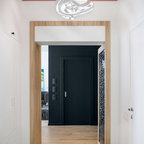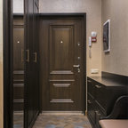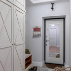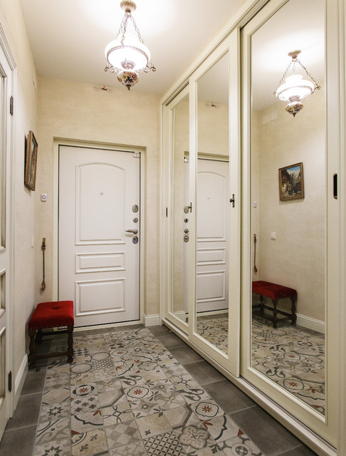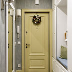 Пример оригинального дизайна интерьера: входная дверь в современном стиле с бежевыми стенами, одностворчатой входной дверью, белой входной дверью и серым полом — Houzz