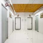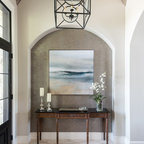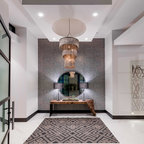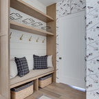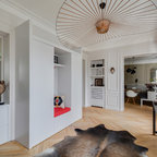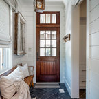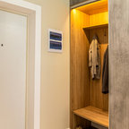 Выдающиеся фото от архитекторов и дизайнеров интерьера: узкая прихожая в современном стиле с бежевыми стенами, паркетным полом среднего тона, одностворчатой входной дверью и белой входной дверью — Houzz