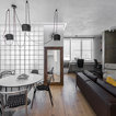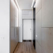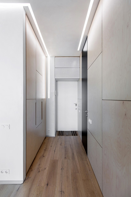Обратите внимание: Заказчики хотели, чтобы интерьер был лаконичным. Поэтом вся мебель в квартире — без ручек. На дверцах шкафа в прихожей вместо них сделали выемки шириной в сантиметр.