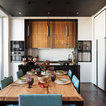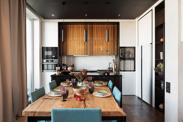 Сочетание деревянного и белого фасадов. Чёрный контрастный потолок для отделения зоны кухни