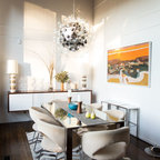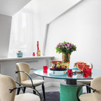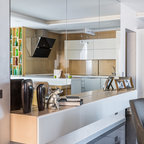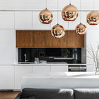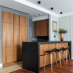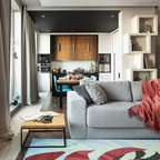 6. Кухня-гостиная 18 кв.м с островом и видом на копию Матисса Автор проекта: Николай Банников, студия дизайна «Восход — это красиво»Место: Санкт-ПетербургСоставляя техническое задание, владельцы квартиры упомянули, что обожают живопись постимпрессионистов и хотели бы каким-то образом интегрировать мотивы известных работ в интерьер. Так на фасаде шкафа в гостиной появилась макрокопия одной из самых известных работ Анри Матисса.