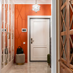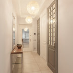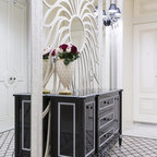 Новые идеи обустройства дома: входная дверь в классическом стиле с серыми стенами, двустворчатой входной дверью, белой входной дверью и белым полом — Houzz