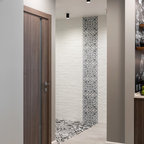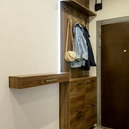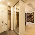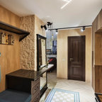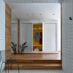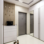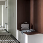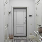 На фото: фойе в современном стиле с белыми стенами и бежевым полом — Houzz