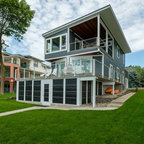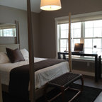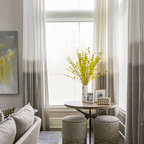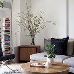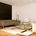 Свежая идея для дизайна: парадная, изолированная гостиная комната среднего размера в стиле модернизм с серыми стенами, паркетным полом среднего тона, стандартным камином, фасадом камина из бетона и разноцветным полом без ТВ - отличное фото интерьера — Houzz