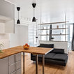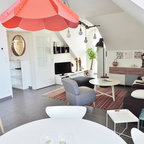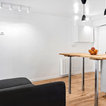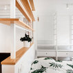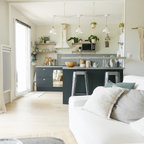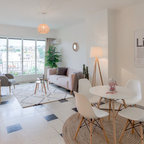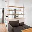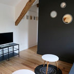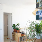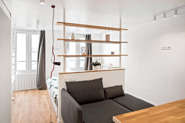 Создайте стильный интерьер: маленькая открытая гостиная комната в скандинавском стиле с библиотекой, белыми стенами, светлым паркетным полом и телевизором на стене - последний тренд — Houzz