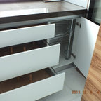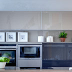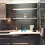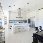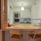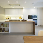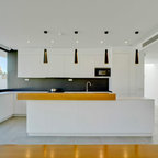 Стильный дизайн: прямая кухня-гостиная среднего размера в современном стиле с плоскими фасадами, фасадами цвета дерева среднего тона и островом - последний тренд — Houzz