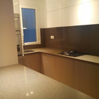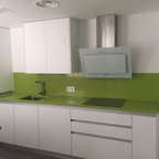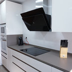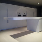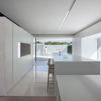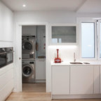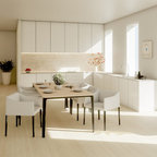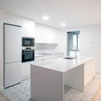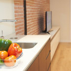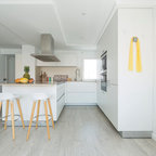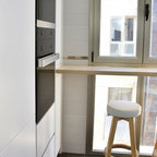 Стильный дизайн: линейная кухня среднего размера в современном стиле с плоскими фасадами, светлыми деревянными фасадами, обеденным столом, монолитной раковиной, белым фартуком, техникой из нержавеющей стали и полом из керамической плитки - последний тренд — Houzz