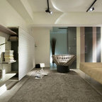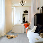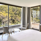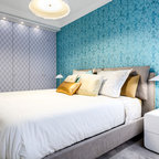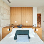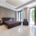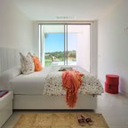 Идея дизайна: хозяйская спальня среднего размера в современном стиле с белыми стенами и полом из керамической плитки без камина — Houzz