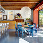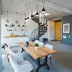 Идея дизайна: гостиная-столовая в стиле лофт с белыми стенами, бетонным полом и серым полом — Houzz