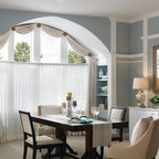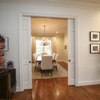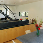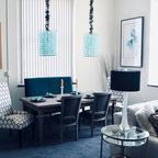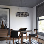 Пример оригинального дизайна: большая гостиная-столовая в стиле модернизм с полом из керамической плитки и серым полом — Houzz