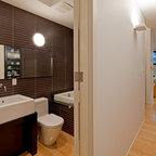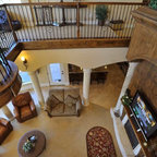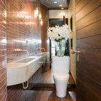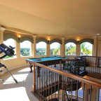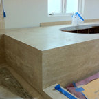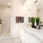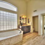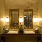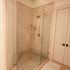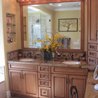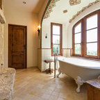 Пример оригинального дизайна: большая главная ванная комната в средиземноморском стиле с фасадами с выступающей филенкой, темными деревянными фасадами, отдельно стоящей ванной, бежевыми стенами, полом из травертина, столешницей из гранита, врезной раковиной, бежевым полом, душем в нише, бежевой плиткой, керамогранитной плиткой, душем с распашными дверями и раздельным унитазом — Houzz