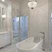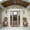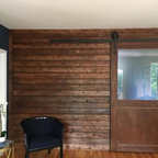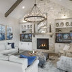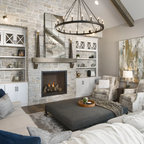 stone wall. built ins. light fixture