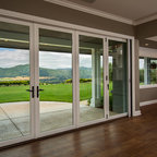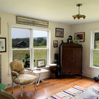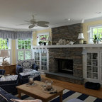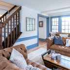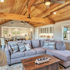 Свежая идея для дизайна: большая открытая гостиная комната в стиле кантри с домашним баром, паркетным полом среднего тона, мультимедийным центром, белыми стенами и коричневым полом - отличное фото интерьера — Houzz