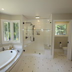 Стильный дизайн: главная ванная комната среднего размера в классическом стиле с фасадами с утопленной филенкой, белыми фасадами, душем без бортиков, раздельным унитазом, белой плиткой, плиткой кабанчик, белыми стенами, мраморным полом, врезной раковиной, мраморной столешницей, белым полом, душем с распашными дверями и белой столешницей - последний тренд — Houzz
