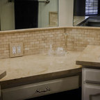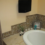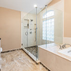 We utilized a Moroccan inspired mirror to accentuate and play with the unusual slanted roof line. By adding clean lines and ample drawers for storage, we were able to transform this outdated bathroom into a true modern master retreat.