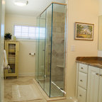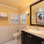 Неиссякаемый источник вдохновения для домашнего уюта: главная ванная комната среднего размера в классическом стиле с фасадами с утопленной филенкой, белыми фасадами, душем без бортиков, раздельным унитазом, белой плиткой, плиткой кабанчик, белыми стенами, мраморным полом, врезной раковиной, мраморной столешницей, белым полом, душем с распашными дверями и белой столешницей — Houzz