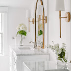 We utilized a Moroccan inspired mirror to accentuate and play with the unusual slanted roof line. By adding clean lines and ample drawers for storage, we were able to transform this outdated bathroom into a true modern master retreat.