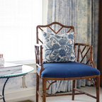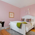 Like the side table and bed color (Very neutral and not too yellow) Also like the bench at the end of the bed. Like the modern lamp with the traditional beside table. Love the play of patterns and textures on the pillows.