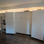 For craft room use glassed in uppers to lighten look. But make the lowers jut into room more so profile isn't so flat.