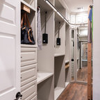 Пример оригинального дизайна: гардеробная комната среднего размера в классическом стиле с фасадами в стиле шейкер, белыми фасадами, ковровым покрытием и серым полом — Houzz