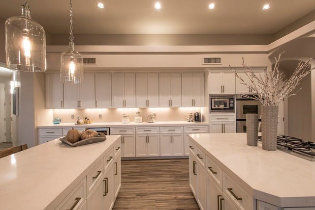 Пример оригинального дизайна: огромная угловая кухня в стиле современная классика с обеденным столом, фасадами с утопленной филенкой, белыми фасадами, столешницей из акрилового камня, бежевым фартуком, фартуком из керамической плитки, техникой из нержавеющей стали, темным паркетным полом, коричневым полом, врезной раковиной и полуостровом — Houzz