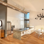 На фото: открытая гостиная комната в стиле модернизм с музыкальной комнатой и бетонным полом с — Houzz