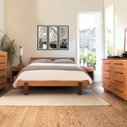 The solid wood Mansfield platform bed is beautifully handcrafted in Vermont with meticulous attention to detail. The bed is available in solid walnut or solid cherry with a virtually invisible protective finish that shows the wood's rich natural colors and wood grains. The wood is from North American and is responsibly harvested. The Mansfield is one of the most space efficient beds and has a beautifully simple lines.