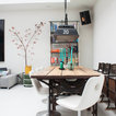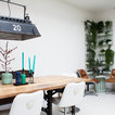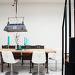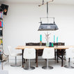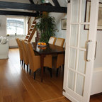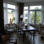 Dining room - eclectic white floor dining room idea in Amsterdam with white walls
