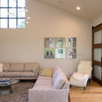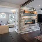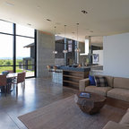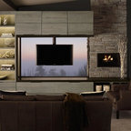 Удачное сочетание для дизайна помещения: большая открытая гостиная комната в современном стиле с горизонтальным камином, белыми стенами, фасадом камина из штукатурки, полом из керамогранита и телевизором на стене - самое интересное для вас — Houzz