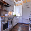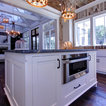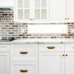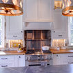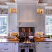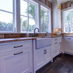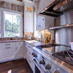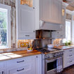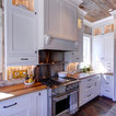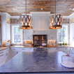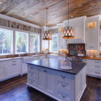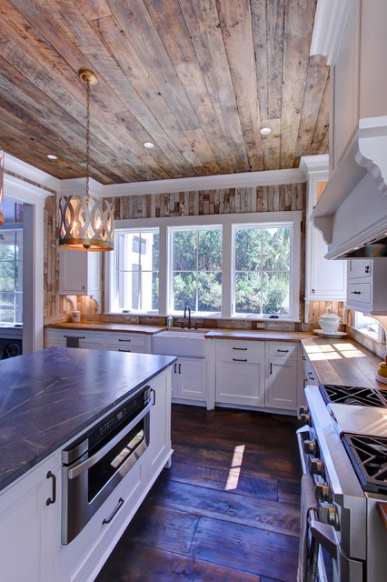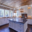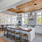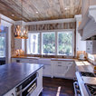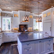 wood ceiling & backsplash against white cabinets