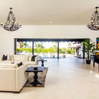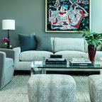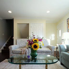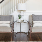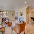 Идея дизайна: большая парадная, изолированная гостиная комната в стиле неоклассика (современная классика) с бежевыми стенами, темным паркетным полом, коричневым полом и диваном у окна — Houzz