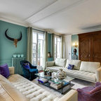Неиссякаемый источник вдохновения для домашнего уюта: большая открытая гостиная комната в стиле фьюжн с белыми стенами, паркетным полом среднего тона, камином, фасадом камина из камня и отдельно стоящим ТВ — Houzz