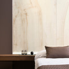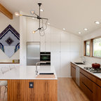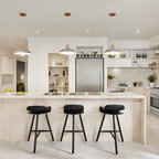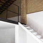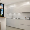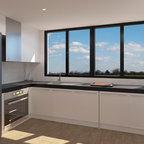 Imagen de cocina open AMBIENTE STONE 2 suelo de gres porcelánico acabado cemento y carpintería de aluminio negro con rotura de puente térmico.
