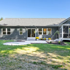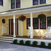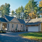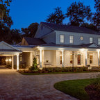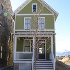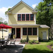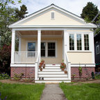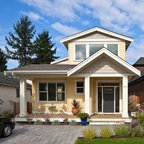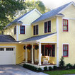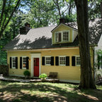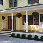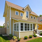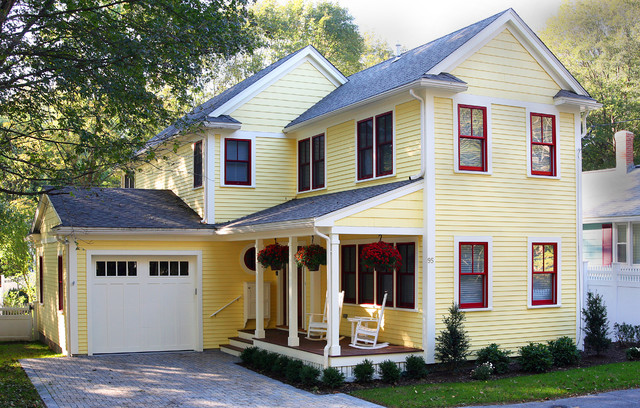 На фото: двухэтажный фасад частного дома среднего размера желтого цвета в классическом стиле с облицовкой из дерева, двускатной крышей и крышей из гибкой черепицы с — Houzz