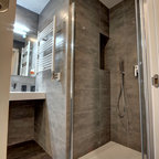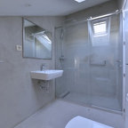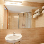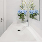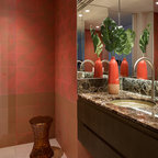 Стильный дизайн: детская ванная комната в современном стиле с фасадами островного типа, красными фасадами, ванной в нише, раздельным унитазом, белой плиткой, белыми стенами, настольной раковиной, разноцветным полом и красной столешницей - последний тренд — Houzz