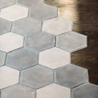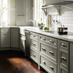 Пример оригинального дизайна: п-образная кухня в стиле современная классика с обеденным столом, фасадами с утопленной филенкой, белыми фасадами, серым фартуком, фартуком из удлиненной плитки, техникой из нержавеющей стали и паркетным полом среднего тона — Houzz