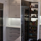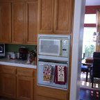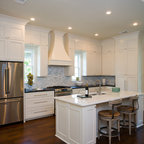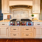 I love the feel of this kitchen; everything except the stainless steel stove vent and fridge.