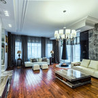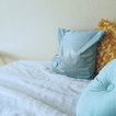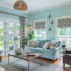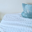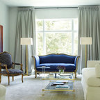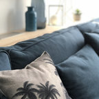 Le canapé a été recouvert d'un plaid de la même couleur du tapis. Les couleurs retenues pour un ensemble sobre ont été le bleu, le doré, le blanc, le gris et le noir