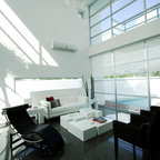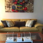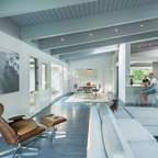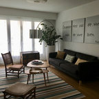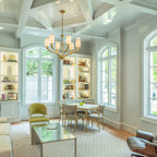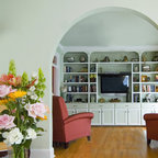 Свежая идея для дизайна: изолированная гостиная комната среднего размера в стиле фьюжн с библиотекой, белыми стенами, полом из винила, отдельно стоящим ТВ и бежевым полом без камина - отличное фото интерьера — Houzz