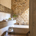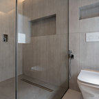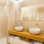Свежая идея для дизайна: ванная комната в современном стиле с фасадами цвета дерева среднего тона, открытым душем, бежевой плиткой, керамогранитной плиткой, бежевыми стенами, полом из керамогранита, серым полом, открытым душем, белой столешницей, плоскими фасадами, душевой кабиной и настольной раковиной - отличное фото интерьера — Houzz