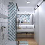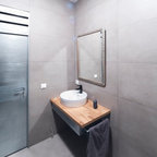 На фото: ванные комнаты в современном стиле с угловым душем, белой плиткой, плиткой мозаикой, белыми стенами, душевой кабиной, настольной раковиной, столешницей из дерева, серым полом, душем с раздвижными дверями и коричневой столешницей — Houzz