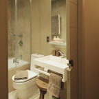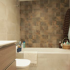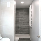 На фото: ванные комнаты среднего размера в современном стиле с душем над ванной, серой плиткой, душевой кабиной, монолитной раковиной и белой столешницей — Houzz