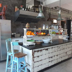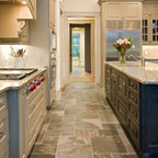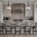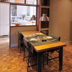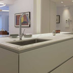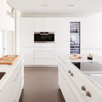 Свежая идея для дизайна: угловая кухня среднего размера в современном стиле с обеденным столом, полом из керамической плитки и бежевым полом - отличное фото интерьера — Houzz