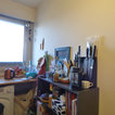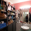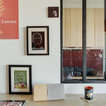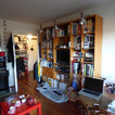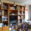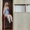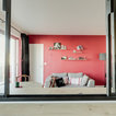 Quelques étagères en bois viennent habiller le mur rouge d'origine qui lui fait face.