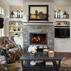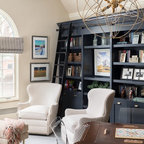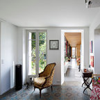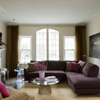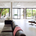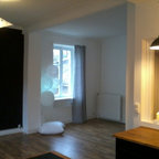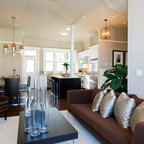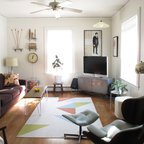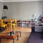 Новый формат декора квартиры: открытая гостиная комната среднего размера в стиле фьюжн с белыми стенами, темным паркетным полом и коричневым полом — Houzz