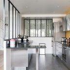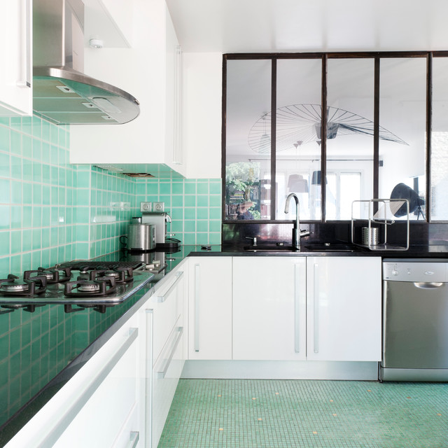 На фото: с высоким бюджетом большие отдельные, угловые кухни в стиле лофт с белыми фасадами и зеленым фартуком без острова — Houzz