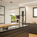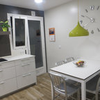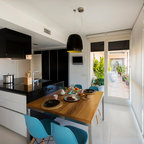 На фото: линейная кухня среднего размера в современном стиле с обеденным столом с — Houzz