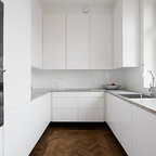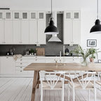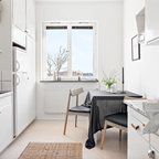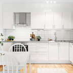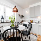 Свежая идея для дизайна: угловая кухня среднего размера в скандинавском стиле с обеденным столом, плоскими фасадами, светлыми деревянными фасадами, черной столешницей, врезной раковиной, белым фартуком, черной техникой и черным полом - отличное фото интерьера — Houzz