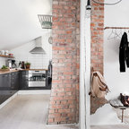 Dark floor, light wood cupboards
